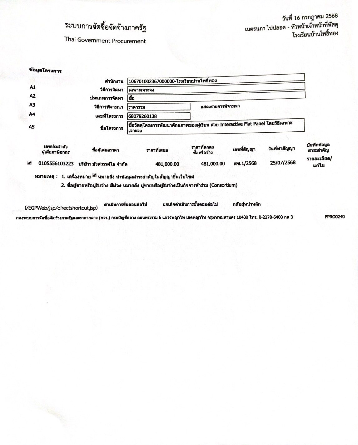 ประกาศผู้ชนะการเสนอราคม ซื้อวัสดุโครงการพัฒนาศักยภาพของผู้เรียน ด้วย Interactive Flat Panel โดยวิธีเฉพาะเจาะจง